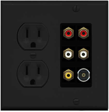Increase quantity for RiteAV 5 RCA (2 Red, 2 White, 1 Yellow) Toslink Wall Plate - Round Outlet [Black/Black]