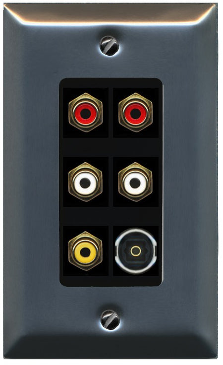 RiteAV 5 RCA (2 Red, 2 White, 1 Yellow) Toslink Wall Plate - 1 Gang Decorative [Stainless/Black]