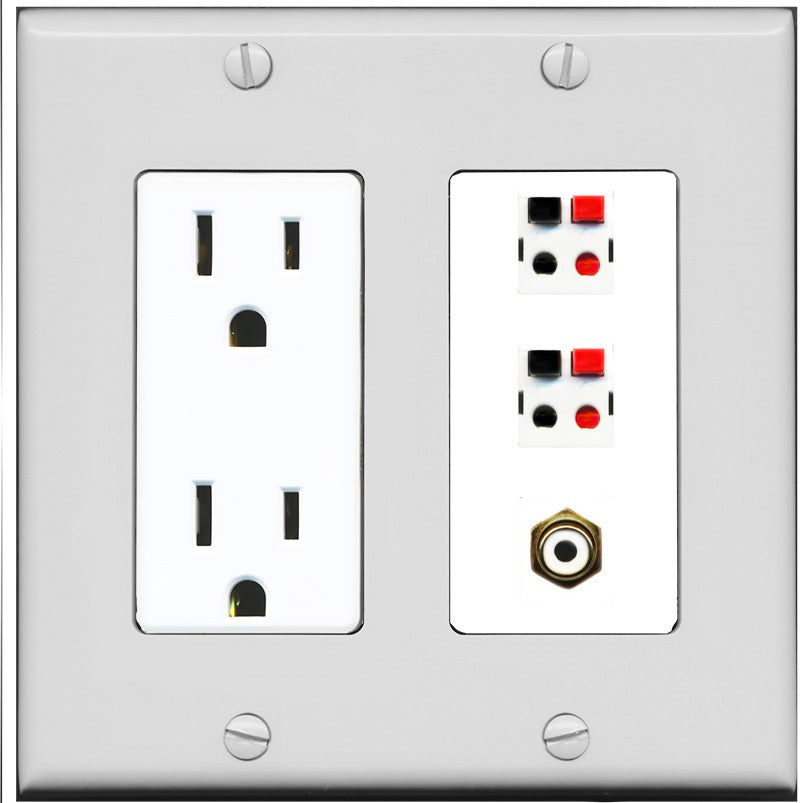 RiteAV 2 Port Speaker Wire Plug Jack Wall Plate with 1 RCA for Subwoofer - Outlet [Gray/White]