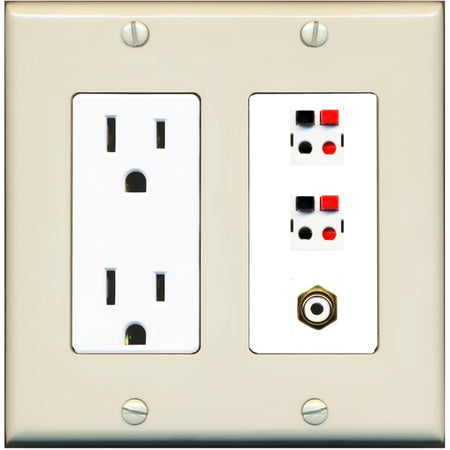 RiteAV 2 Port Speaker Wire Plug Jack Wall Plate with 1 RCA for Subwoofer - Outlet [Light-Almond/White]
