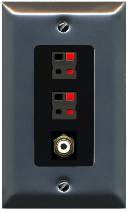 RiteAV 2 Port Speaker Wire Plug Jack Wall Plate with 1 RCA for Subwoofer - 1 Gang Decorative [Stainless/Black]