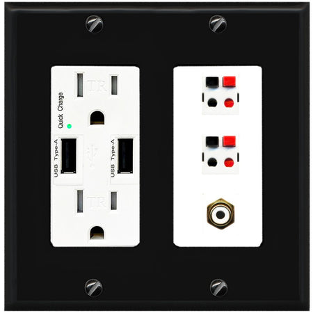 RiteAV 2 Port Speaker Wire Plug Jack Wall Plate with 1 RCA for Subwoofer - USB Outlet [Black/White]