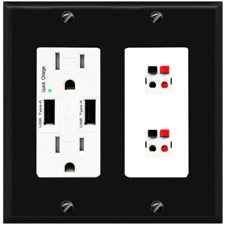 RiteAV 2 Port Speaker Wire Plug Jack Wall Plate - USB Outlet [Black/White]