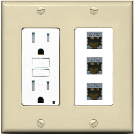 RiteAV 3 Port Cat6A Ethernet Wall Plate - GFCI Outlet [Ivory/White]