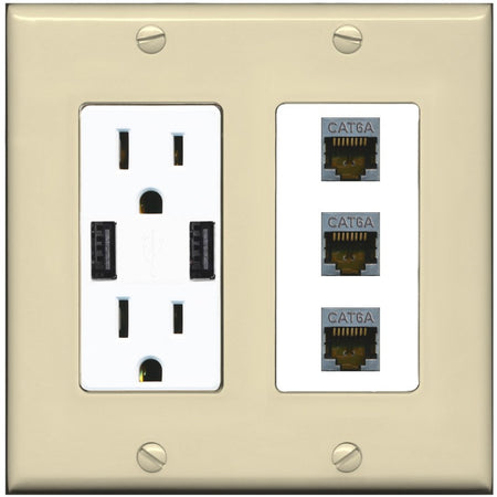 RiteAV 3 Port Cat6A Ethernet Wall Plate - USB Outlet [Ivory/White]