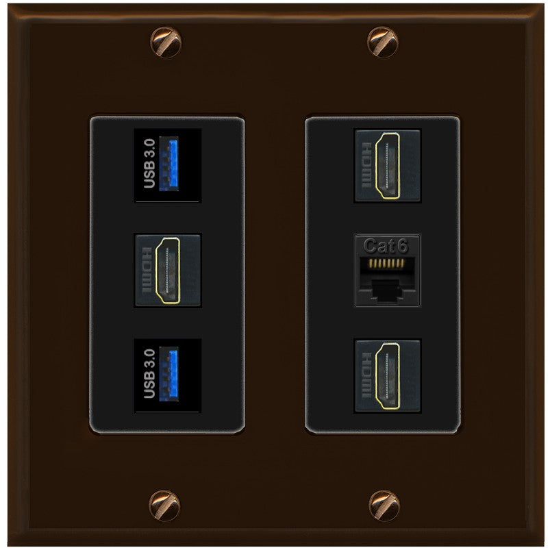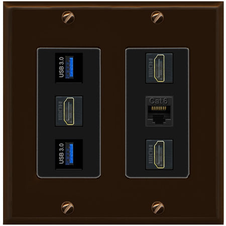 RiteAV 3 Port HDMI 2 Port USB 3.0 1 CAT6-RJ45 Wall Plate - 2 Gang [Brown/Black]
