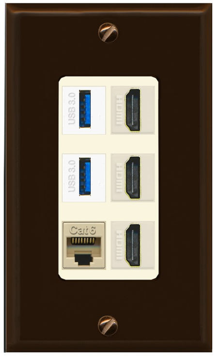 RiteAV 3 Port HDMI 2 Port USB 3.0 1 CAT6-RJ45 Wall Plate - 1 Gang Decorative [Brown/Light-Almond]