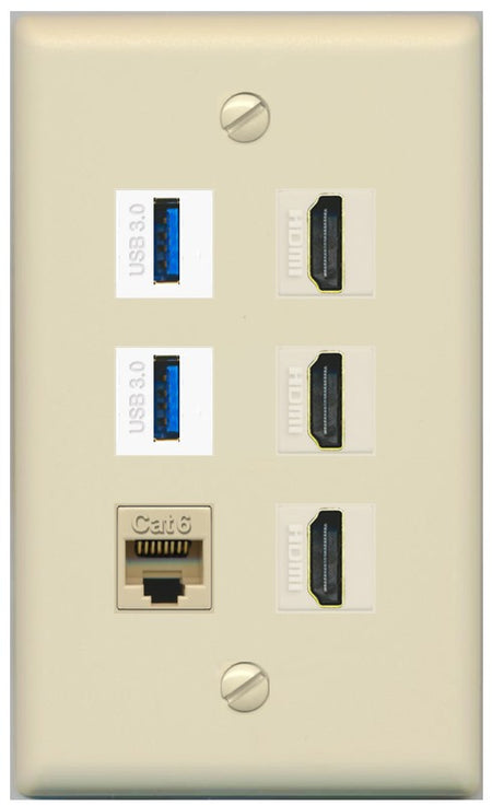 Decrease quantity for RiteAV 3 Port HDMI 2 Port USB 3.0 1 CAT6-RJ45 Wall Plate - Flat Style [Ivory/Ivory]