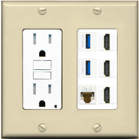 Increase quantity for RiteAV 3 Port HDMI 2 Port USB 3.0 1 CAT6-RJ45 Wall Plate - GFCI Outlet [Ivory/White]