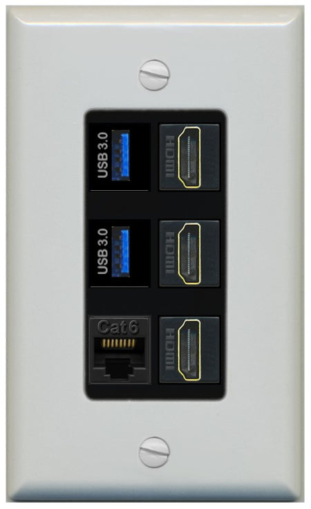 RiteAV 3 Port HDMI 2 Port USB 3.0 1 CAT6-RJ45 Wall Plate - 1 Gang Decorative [Gray/Black]