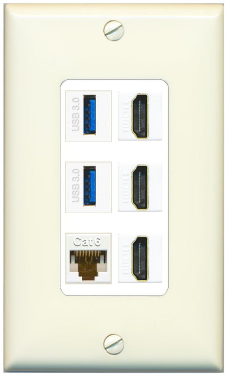 RiteAV 3 Port HDMI 2 Port USB 3.0 1 CAT6-RJ45 Wall Plate - 1 Gang Decorative [Light-Almond/White]
