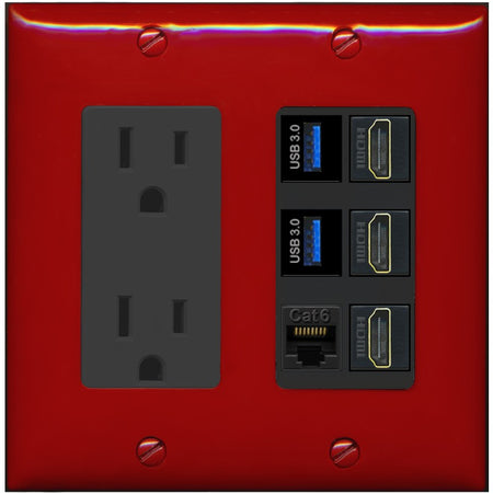 RiteAV 3 Port HDMI 2 Port USB 3.0 1 CAT6-RJ45 Wall Plate - Outlet [Red/Black]