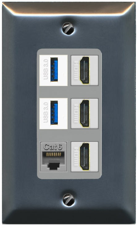 RiteAV 3 Port HDMI 2 Port USB 3.0 1 CAT6-RJ45 Wall Plate - 1 Gang Decorative [Stainless/Gray]