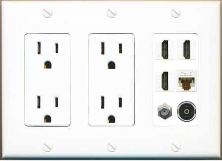 RiteAV 3 Port HDMI 1 Coax TV F-Type Cat6 Ethernet Toslink Optical Wall Plate - 3 Gang 2 Outlet [White]