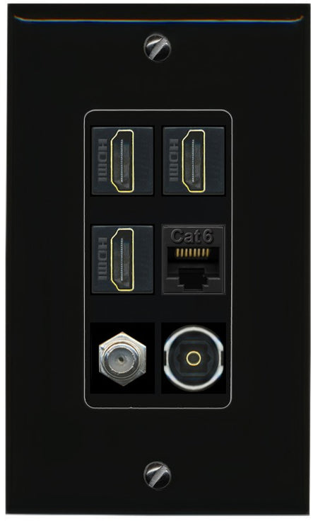 RiteAV 3 Port HDMI 1 Coax TV F-Type Cat6 Ethernet Toslink Optical Wall Plate - 1 Gang Decorative [Black/Black]