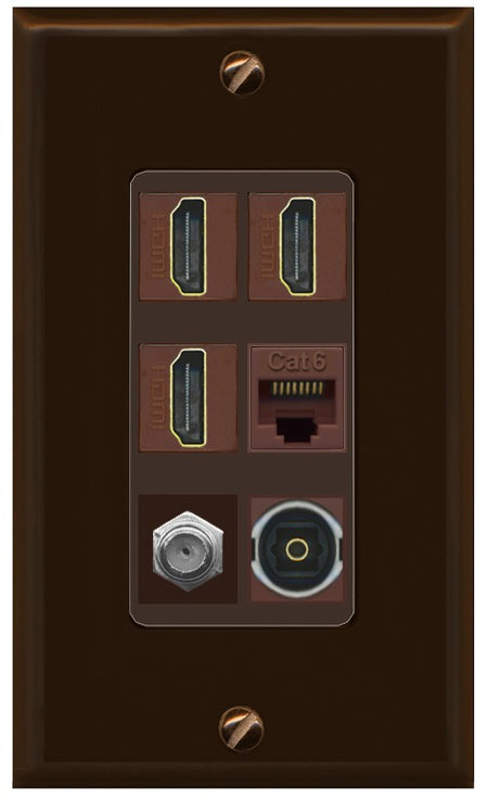 RiteAV 3 Port HDMI 1 Coax TV F-Type Cat6 Ethernet Toslink Optical Wall Plate - 1 Gang Decorative [Brown/Brown]