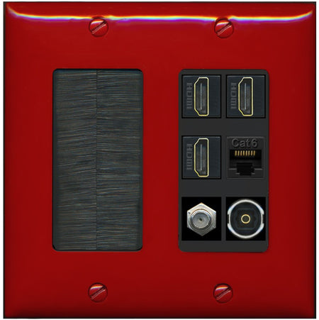 RiteAV 3 Port HDMI 1 Coax TV F-Type Cat6 Ethernet Toslink Optical Wall Plate - Brush [Red/Black]