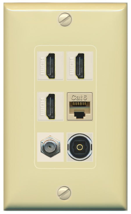 RiteAV 3 Port HDMI 1 Coax TV F-Type Cat6 Ethernet Toslink Optical Wall Plate - 1 Gang Decorative [Ivory/Ivory]