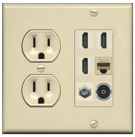 RiteAV 3 Port HDMI 1 Coax TV F-Type Cat6 Ethernet Toslink Optical Wall Plate - Round Outlet [Ivory/Ivory]