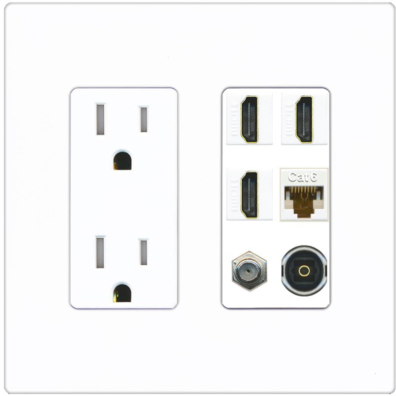 RiteAV 3 Port HDMI 1 Coax TV F-Type Cat6 Ethernet Toslink Optical Wall Plate - Tamper-Resistant Outlet [Screwless White]