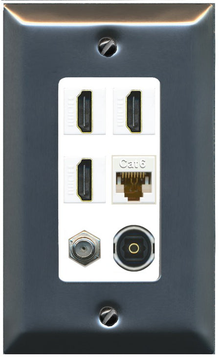 RiteAV 3 Port HDMI 1 Coax TV F-Type Cat6 Ethernet Toslink Optical Wall Plate - 1 Gang Decorative [Stainless/White]