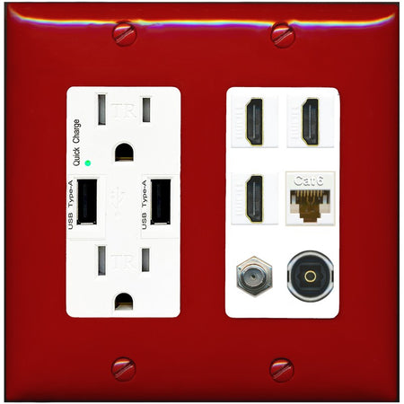 RiteAV 3 Port HDMI 1 Coax TV F-Type Cat6 Ethernet Toslink Optical Wall Plate - USB Outlet [Red/White]