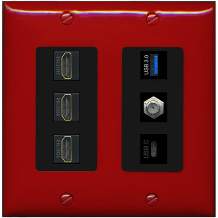 RiteAV 3 HDMI USB3 USBC Coax Wall Plate - 2 Gang [Red/Black]