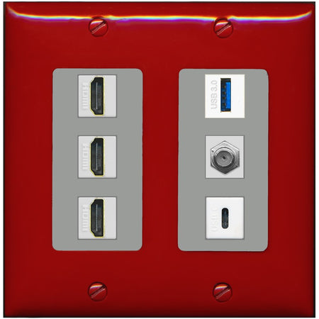 RiteAV 3 HDMI USB3 USBC Coax Wall Plate - 2 Gang [Red/Gray]