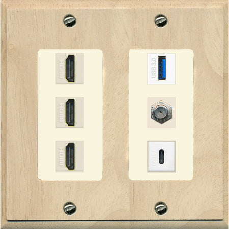 RiteAV 3 HDMI USB3 USBC Coax Wall Plate - 2 Gang [Wood/Light-Almond]