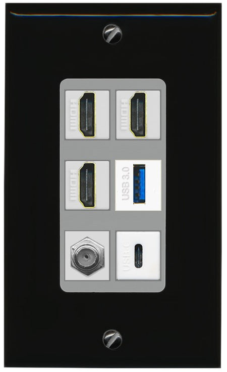 RiteAV 3 HDMI USB3 USBC Coax Wall Plate - 1 Gang Decorative [Black/Gray]