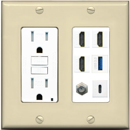 Increase quantity for RiteAV 3 HDMI USB3 USBC Coax Wall Plate - GFCI Outlet [Ivory/White]