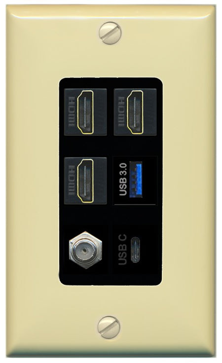 RiteAV 3 HDMI USB3 USBC Coax Wall Plate - 1 Gang Decorative [Ivory/Black]