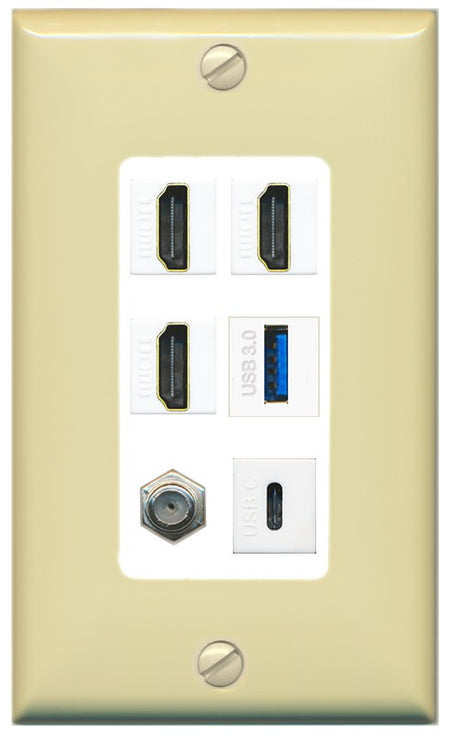 RiteAV 3 HDMI USB3 USBC Coax Wall Plate - 1 Gang Decorative [Ivory/White]