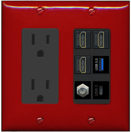 RiteAV 3 HDMI USB3 USBC Coax Wall Plate - Outlet [Red/Black]