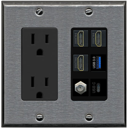 RiteAV 3 HDMI USB3 USBC Coax Wall Plate - Outlet [Stainless/Black]