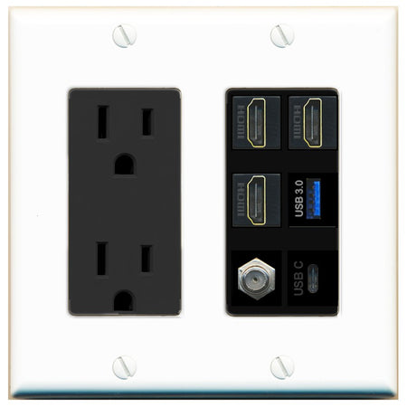 RiteAV 3 HDMI USB3 USBC Coax Wall Plate - Outlet [White/Black]