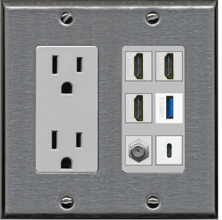 RiteAV 3 HDMI USB3 USBC Coax Wall Plate - Outlet [Stainless/Gray]