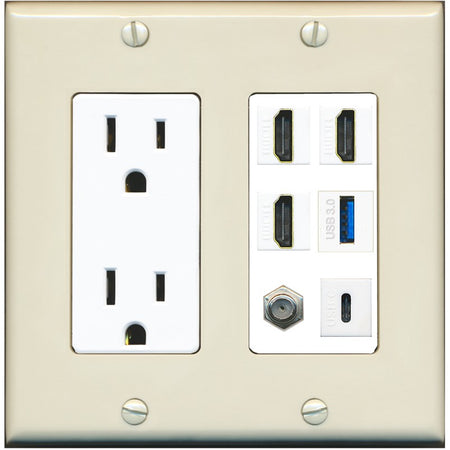 RiteAV 3 HDMI USB3 USBC Coax Wall Plate - Outlet [Light-Almond/White]