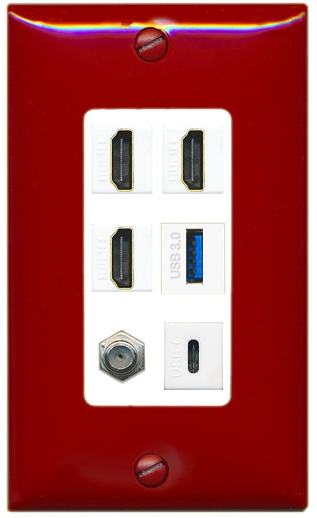 RiteAV 3 HDMI USB3 USBC Coax Wall Plate - 1 Gang Decorative [Red/White]