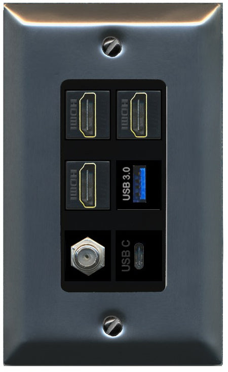 RiteAV 3 HDMI USB3 USBC Coax Wall Plate - 1 Gang Decorative [Stainless/Black]