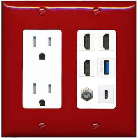 RiteAV 3 HDMI USB3 USBC Coax Wall Plate - Tamper-Resistant Outlet [Red/White]