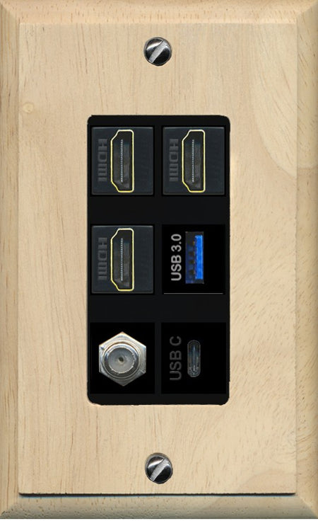 RiteAV 3 HDMI USB3 USBC Coax Wall Plate - 1 Gang Decorative [Wood/Black]