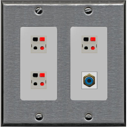 RiteAV 3 Port Speaker Wire Plug Jack Wall Plate with 1 RCA for Subwoofer - 2 Gang [Stainless/Gray]