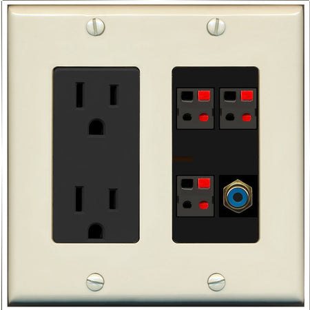 RiteAV 3 Port Speaker Wire Plug Jack Wall Plate with 1 RCA for Subwoofer - Outlet [Light-Almond/Black]