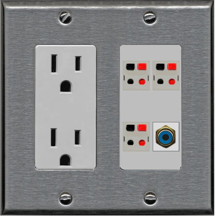 RiteAV 3 Port Speaker Wire Plug Jack Wall Plate with 1 RCA for Subwoofer - Outlet [Stainless/Gray]