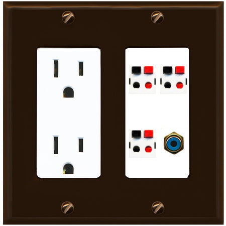 RiteAV 3 Port Speaker Wire Plug Jack Wall Plate with 1 RCA for Subwoofer - Outlet [Brown/White]
