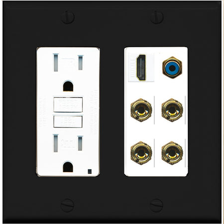 RiteAV 2 Speaker 4 Banana Binding Post HDMI RCA Wall Plate - GFCI Outlet [Black/White]