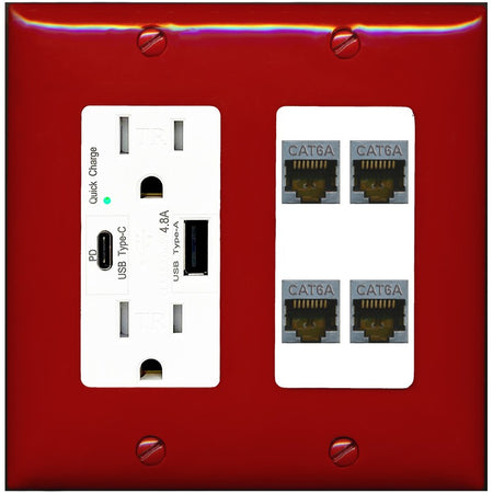 RiteAV - 4 Port Cat6A Ethernet Wall Plate - USB A+C Outlet [Red/White]