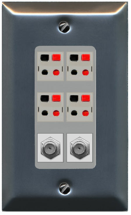 RiteAV 4 Speaker 2 Port Coax Cable TV Wall Plate - 1 Gang Decorative [Stainless/Gray]