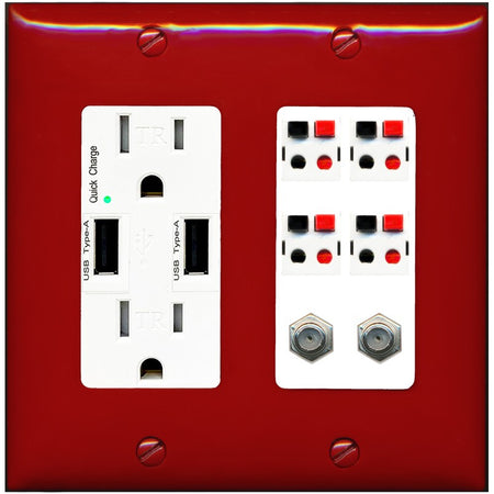 RiteAV 4 Speaker 2 Port Coax Cable TV Wall Plate - USB Outlet [Red/White]